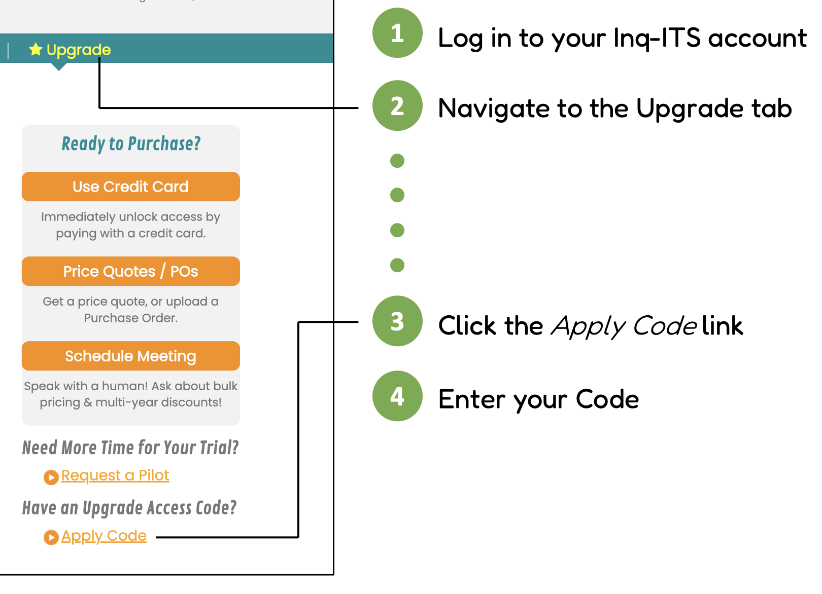 If you are given an invite code to upgrade your account, log in to your account and go to the Upgrade tab. Click Apply Code on the right, then paste your code into the text box.